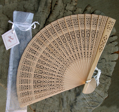 8" Natural Beige / Ivory Tan Sandalwood Folding Hand Fan w/ Organza Bag for Weddings (10 PACK)