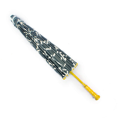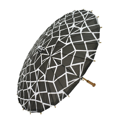 Design: Black and White Geometric Pattern Diameter: 32" D Length, Top to Bottom: 25.5" L Materials: Paper, Bamboo, Plastic Internal Hub Sun Protection: Yes Sheer/Transparent: Only Allows Some Light Through Covered Center Hub: Covered Center Top/Hub Handle Design: Longer Premium Handle Best Size For: Adults