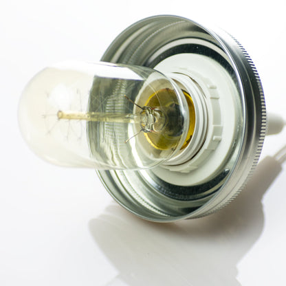 Type of Lid: Screw-On Wide Mouth Lid for Wide Mouth Mason Jars. Size of opening: ~3.5 inches. Size of Hole: 1.6 inches. Lid Color: Silver. Supported Pendant Light Cords: - 11FT White (11UL1SC-WH) - 15FT White (15UL1SC-WH) - 11FT Black (11UL1SC-BK) - 15FT Black (15UL1SC-BK) - 11FT Clear (11UL1SC-CL) - 15FT Clear (15UL1SC-CL) - 19FT Triple Socket White (19UL3SC-WH) - 19FT Triple Socket Black (19UL3SC-BK) Included Bulbs: Not Included. *Light Bulb Not Included.