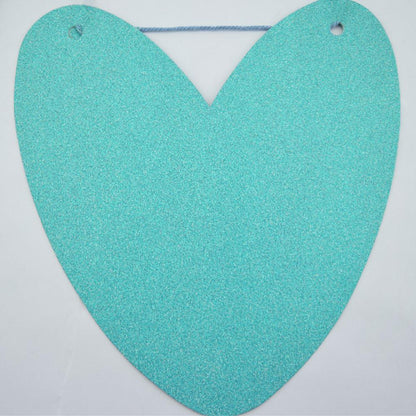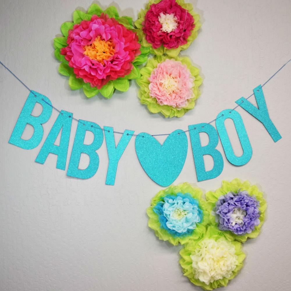 Product Specifications: Design: 'Baby ♥ Boy' Letter Dimensions: Each Letter is about 8 inches tall and 4 inches wide. Color: Blue Glitter (Glitter will not come off). Material: Thick Glitter Card Stock. Overall Length: Letter placement is adjustable. Total string Length is 9 Feet Long.