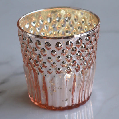 Rose Gold Ophelia Mercury Glass Tealight Holders - Set of 6 - Our small vertical lined mercury glass candle holders have a diamond hobnail texture on the top. They are the perfect addition to your holiday tables or as gifts for your wedding guests! Product Specifications Measurements: 2.75-inch diameter x 3-inches high. Food Use?: No Candle: For use with battery operated or real tea light *Please Note: As these are hand-crafted items, each piece may vary slightly in appearance from one another.