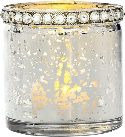 BLOWOUT Vintage Mercury Glass Candle Holder with Rhinestones (2.5-Inch, Thea Design, Silver) - For Use with Tea Lights - For Home Decor, Parties, and Wedding Decorations
