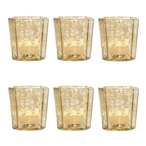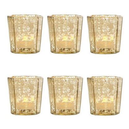 6 Pack | Vintage Mercury Glass Tealight Candle Holders (2.75-Inch, Patricia Design, Gold) - For Use with Tea Lights - For Home Decor, Parties, and Wedding Decorations